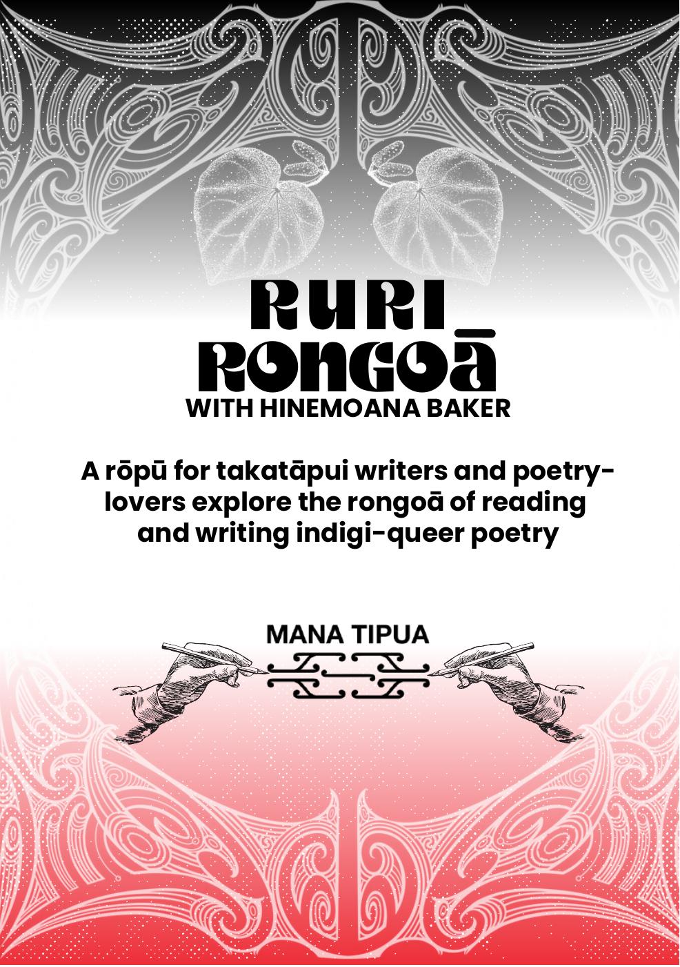 - Ruri Rongoā a regular online (sometimes in-person) hui for takataapui poets and poem appreciators, run by Hinemoana Baker supported by Mana Tipua